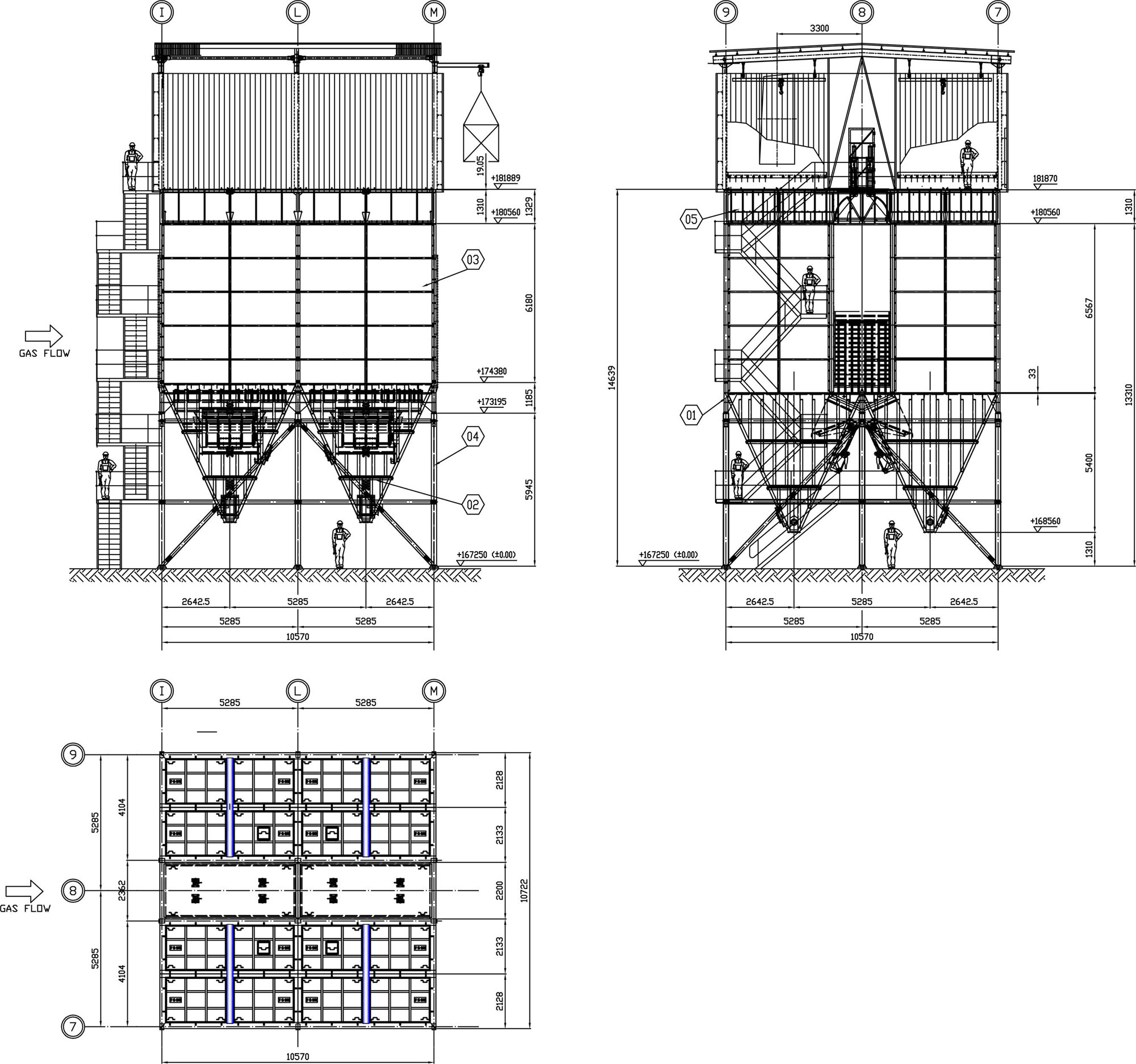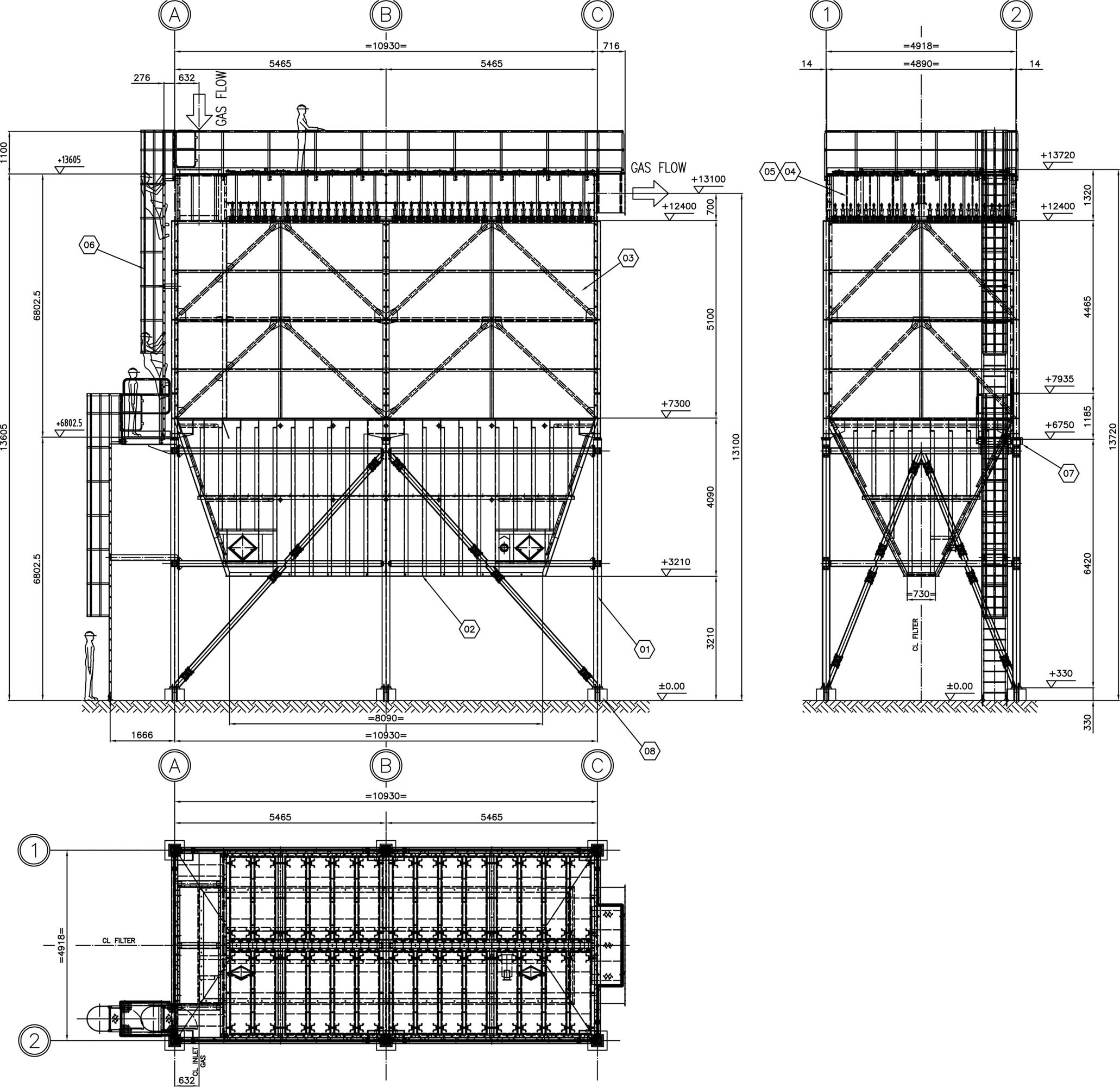 Proyecto nuevos filtros de mangas tipo horno y grilla, intercambiador, conductos, penthouse, cálculos de cargas sobre fundaciones, estructurales y termomecánicos.